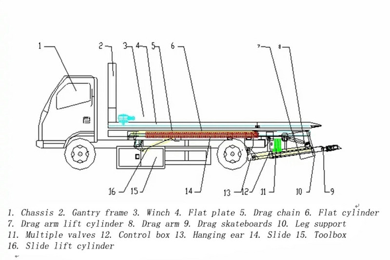 3 тонналық жазық жол қалпына келтіру жүк көлігінің үстіңгі құрылымы негізінен тірек рычагынан, гидравликалық жүйеден, лебедкадан, сым арқаннан және басқару жүйесінен тұрады, бұл көлікті көтеруге, тартуға және сүйреуге мүмкіндік береді. Дәл көтеру және тарту үшін гидравликалық басқарылатын оның берік және икемді үстіңгі құрылымы оны жол жиегінде құтқару, апаттан тазарту және заңсыз тұраққа қойылған көліктерді сүйреу сияқты қауіпсіз және тиімді операциялар үшін өте қолайлы етеді.