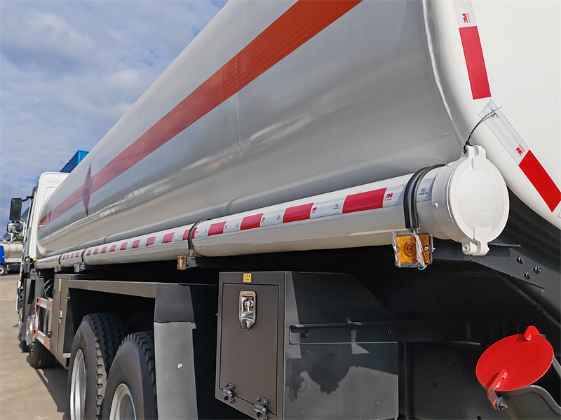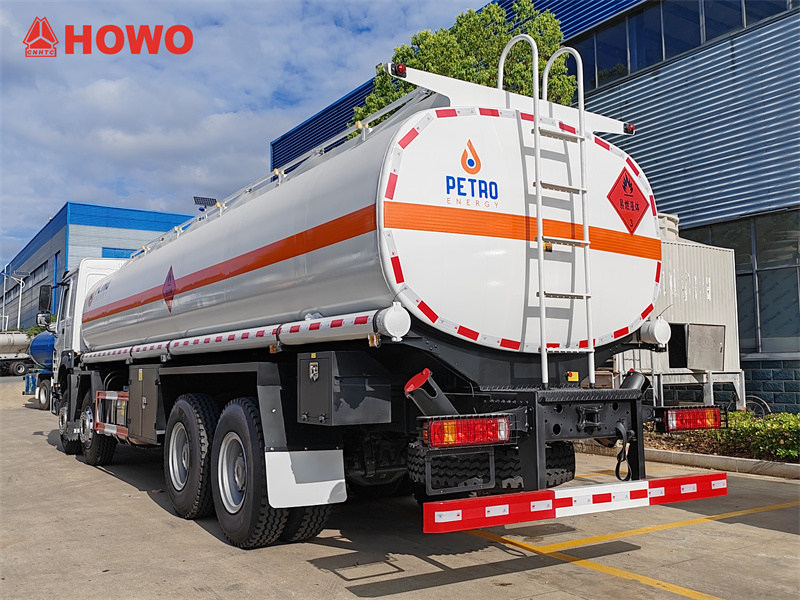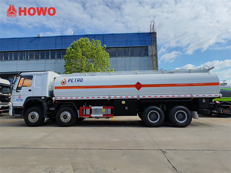 Sinotruk HOWO 8x4 25 CBM мұнай құю жүк көлігі, Sinotruk HW76 кабина шассиін, 8x4 жетегі бар, 1800+4625+1350 мм доңғалақ базасын пайдаланады, Sinotruk WD615.47 қозғалтқышымен, HW19710 беріліс қорабымен жабдықталған, жоғарғы бөлігі 25 текше метрлік көміртекті болаттан жасалған мұнай багынан тұрады, 6 бөлімнен тұрады, сәйкесінше 3, 4, 4, 4, 5, 5 текше метр сыйымдылыққа ие, әрқайсысы еуропалық стандартты люкпен, төменгі клапанмен, май құю клапанымен, жоғарғы жолмен, тұтқамен, 1 апаттық клапанмен, 2 май құю құбырымен жабдықталған.