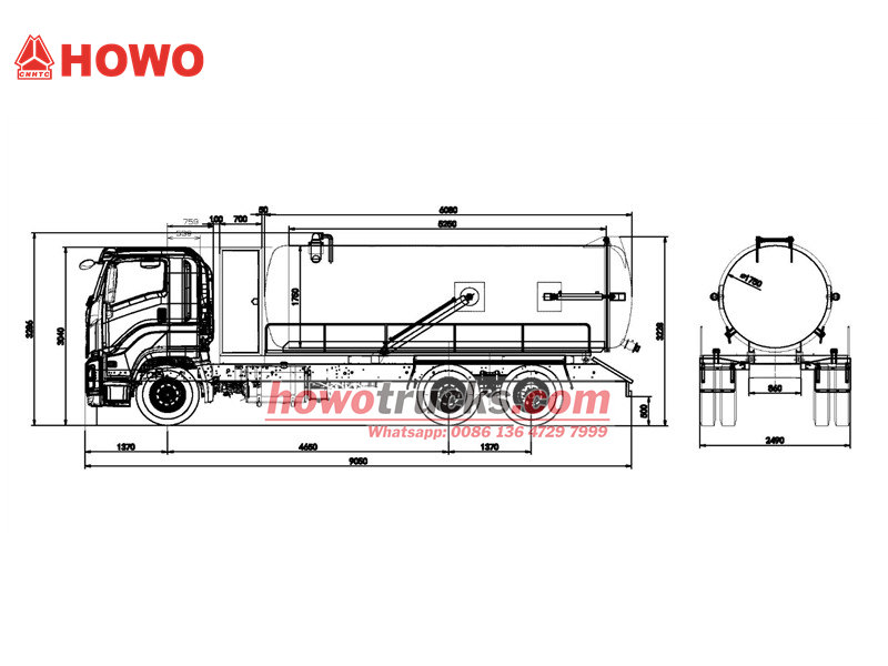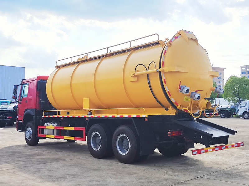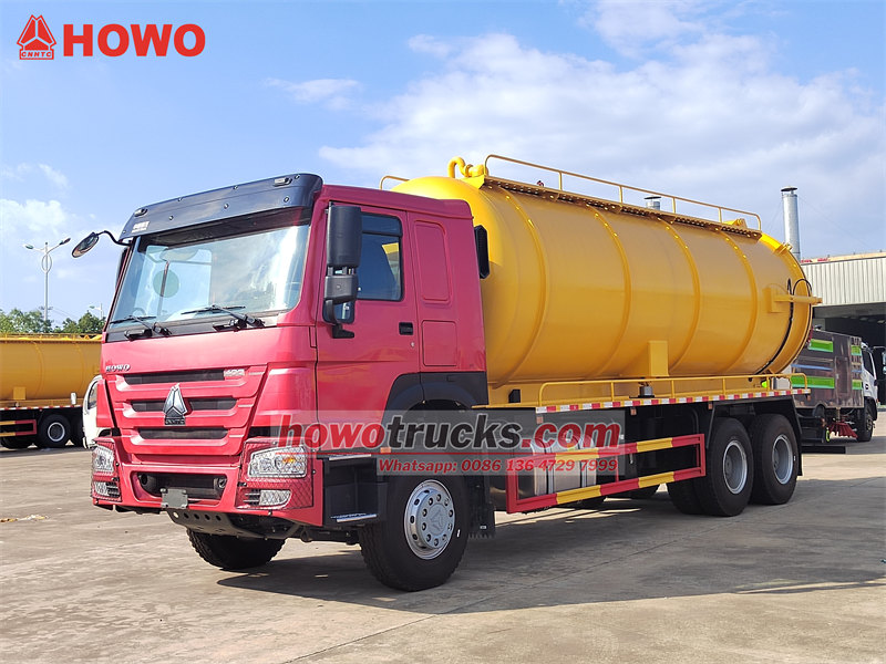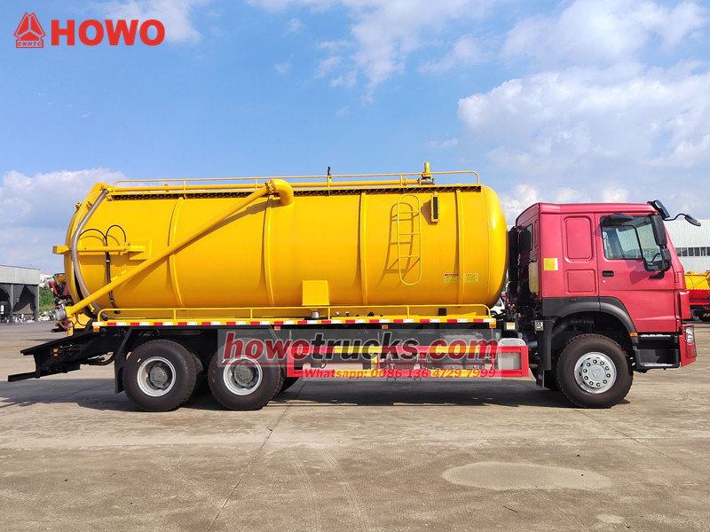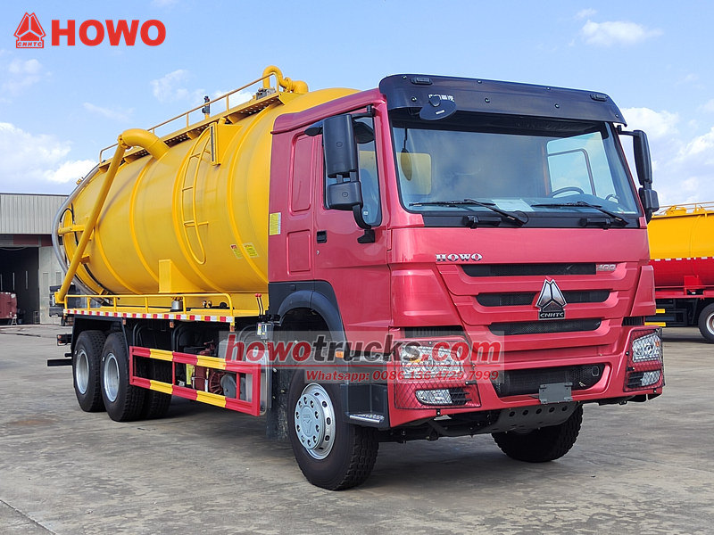 HOWO шаңсорғыш кәріз тазалағышы SINOTRUK HOWO 6×4 шассиінде жасалған және 93% жоғары вакуум деңгейін жасай алатын итальяндық Jurop вакуумдық сорғысымен жұптастырылған 20 текше метрлік көміртекті болат багы бар. Көлік 400 ат күші бар Weichai қозғалтқышымен және 10 жылдамдықты беріліс қорабымен жұмыс істейді, гидравликалық бекітілген артқы қақпақпен, толып кетуге қарсы дабыл жүйесімен және 10 метрлік сорғыш шлангімен жабдықталған. Ол өзен арналары мен қалалық құбыр желілерінде ірі көлемді қалдықтарды тасымалдау операциялары үшін арнайы жасалған.
