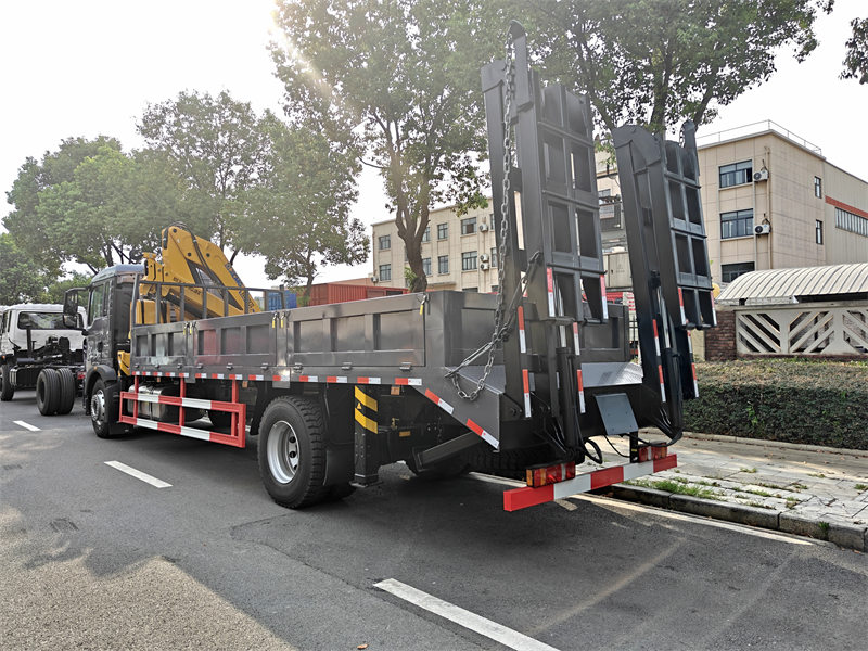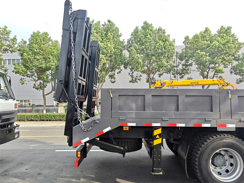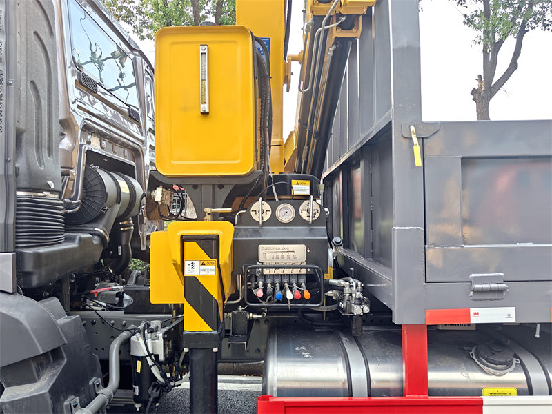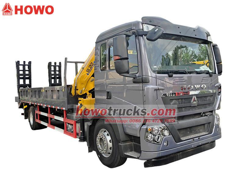 ♦ Howo 4x2 жүк көлігі 6 тонналық шарнирлі кранмен (10 тонналық айналу моменті/8,6 м биіктік) және 20 тонналық платформалы тасымалдау функциясымен жабдықталған..