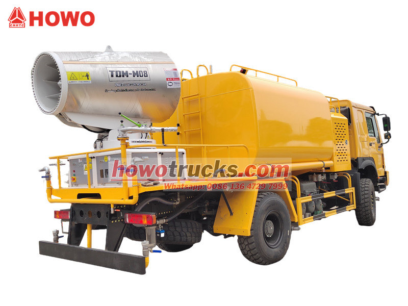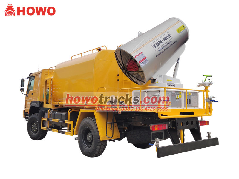 HOWO 4×4 су зеңбірек жүк көлігі HOWO толық жетекті шассиінде жасалған, 300 ат күші бар қозғалтқышпен және 4×4 жетек жүйесімен жабдықталған, күрделі жерлерде керемет өнімділік береді. 90 форсункасы бар ультра ұзақ қашықтыққа арналған 80 метрлік су зеңбірегімен жабдықталған ол ұсақ су тұманын (20-200 мкм) шашырата алады, максималды қамту аймағы 20 000 мкм. 10 000 литрлік үлкен сыйымдылықты су ыдысымен және жоғары қысымды бүрку жүйесімен біріктірілген ол жол шаңын азайту, құрылыс алаңындағы шаңды басу және ауылшаруашылық бүрку сияқты міндеттерді тиімді орындайды. Ол әсіресе тау-кен өндірісі аймақтарында, порттарда, қалалық қоршаған ортаны қорғауда және басқа да салаларда шаңды бақылау үшін өте қолайлы.