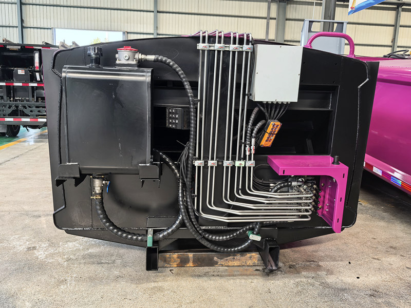 ●Қоқыс таситын көлік түсіру орнына келгенде, контейнердің артқы қақпағы гидравликалық цилиндр арқылы ашылады, ал сығымдау камерасындағы қоқыс біркелкі итеріліп, таза және жылдам түсіруді қамтамасыз етеді.