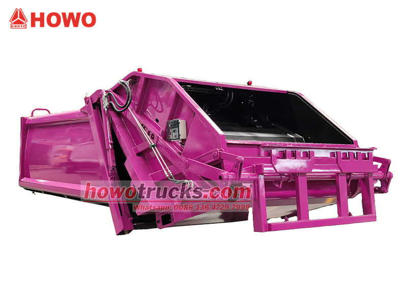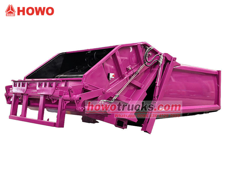 Howo 8cbm тығыздалатын қоқыс көлігінің үстіңгі құрылымы (сонымен қатар артқы тиегіш тығыздайтын жүк көлігінің жоғарғы корпусы, 8cbm қоқыс тығыздайтын жүк көлігінің жоғарғы корпус жинағы, қоқыс тығыздайтын жүк көлігінің үстіңгі корпус жинағы, қалдықтарды тығыздайтын жүк көлігінің жоғарғы корпус жинағы, артқы тиегіштің су жинайтын жүк көлігінің жинағы және т.б. деп аталады) Жоғарғы бөлігі - 8 см қоқыс жәшігі, артқы жағы - шелек аударатын механизм, жүк көлігін тиеу және түсірудің 3 әдісі бар.
