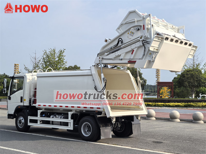 Қытайлық жеңіл жүк көлігі Sinotruk HOWO артқы тиегіші - HOWO 4×2 жеңіл жүк көлігінің шассиінде жасалған, WEICHAI WP2.3NQ130E50 моделінің 130 ат күшімен, Euro 5P дизельді қозғалтқышымен және 6F және 1R WLY механикалық беріліс қорабымен жабдықталған кәсіби қоқыс жинау көлігі. HOWO 8000L қоқыс жинайтын қоқыс жүк көлігі 8cbm тығыздағыш танкер корпусымен жабдықталған, барлығы халықаралық St52 материалына негізделген, Q355 материалына тең, бүйір және еден қалыңдығы 4 мм. Ыңғайлы жұмыс істеуге арналған толық гидравликалық жұмыс құрылғысы. Итеру тақтасына, артқы артқы қақпаққа, сырғымалы тақтаға, қырғышқа, артқы еңкейту құрылғысына арналған гидравликалық цилиндр. Сондай-ақ, оңай жұмыс істеу үшін CAN-BUS басқару құрылғысымен сәйкес келеді.