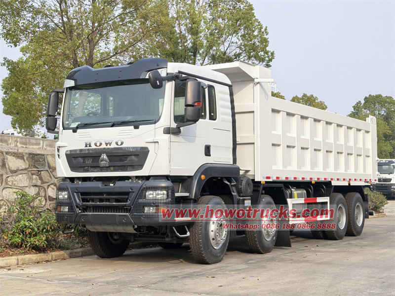The Howo 8x4 30-ton dump truck adopts a Sinotruk Howo TX 371HP right-hand drive chassis with a wheelbase of 1800+3825+1350mm, a Sinotruk WD615.47 engine, and an HW19710 transmission. The superstructure is a heavy-duty dump body with dimensions of 7200x2400x1500mm, made of carbon steel with 6mm thick sides and 8mm thick bottom. The tailgate can be opened, the side panels have a grid pattern and are fully welded, and it has a front-mounted hydraulic lift with a lifting angle ≥ 45°.